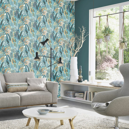 Décoration murale Papier peint Néo Jungle - Feuilles exotiques bleues