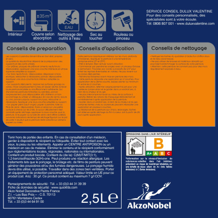 La peinture mate qui résiste aux taches, aux rayures, aux frottements et qui permet de garder longtemps la couleur intense des murs grâce à sa technologie Color Resist, au service de la déco. Peinture avec finition mate extrêmement résistante aux chocs et aux rayures tout en étant facile à nettoyer. Séchage rapide avec possibilité de recouvrir dans les 6h. Peinture idéale pour tous types de supports (portes, plinthes, meubles) dans des pièces sèches (salon, séjour, chambre, entrée...).