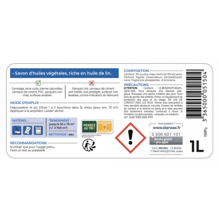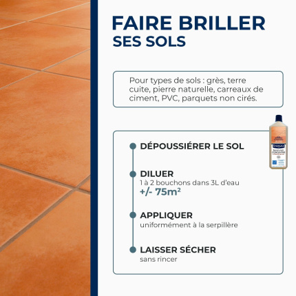 Nettoie et fait briller, sans rincer, sols et surfaces lavables. Nourrit terres cuites et pierres naturelles. Savon d'huiles végétales, riche en huile de lin.