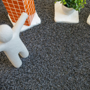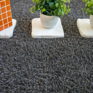 Texture réaliste du gazon synthétique gris foncé Arty 20 mm, mise en scène gourmande Mise en scène colorée sur gazon décoratif Arty Couleur Gris Foncé 20 mm