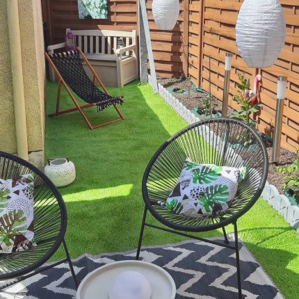 J’ai un gazon synthétique pro dans ma maison principale depuis 8 ans qui est encore magnifique et confortable donc bien sure ce n’est pas comparable avec celui ci par rapport au prix. Ne vous attendez pas à une qualité de ouf mais très bon rapport qualité prix !