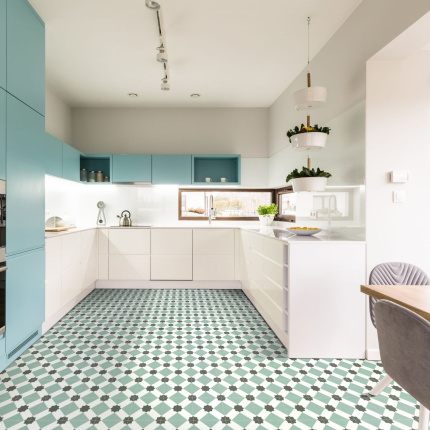 Sol Vinyle First - Effet carreaux de ciment géométrique - Vert d'eau