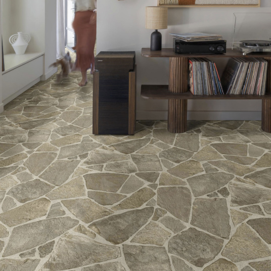 Inspiré des dallages en pierre naturelle de type opus incertum, ce sol PVC présente des formes irrégulières qui apportent du rythme et du caractère à la pièce, une vraie alternative aux sols plus classiques. Sa teinte beige soutenue, aux nuances minérales, crée une base chaleureuse et structurée, idéale pour une ambiance authentique. Un sol PVC accessible, au rendu réaliste, qui reproduit l’aspect de grands pavés en pierre. Ses variations de formes et de teintes évitent l’effet uniforme et donnent au sol une vraie présence visuelle, tout en conservant un bel équilibre. Facile à poser et à entretenir, ce sol souple est pensé pour un usage quotidien. Classé usage 22, il convient parfaitement à une chambre, un salon sans accès extérieur, une cuisine, une salle de bain, une buanderie ou une salle de jeux. Avec une isolation acoustique de 18 dB, il améliore le confort en atténuant les bruits d’impact et en rendant la marche plus agréable. Une solution pratique et décorative, proposée à un très bon rapport qualité/prix.