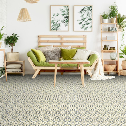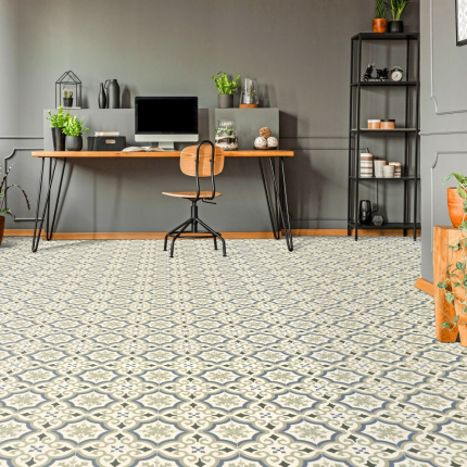 Sol Vinyle First - Effet carreaux de ciment arabesques - Vert et bleu