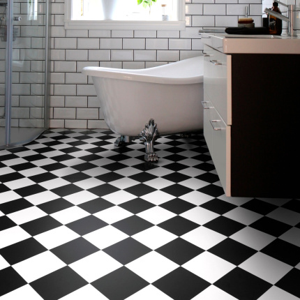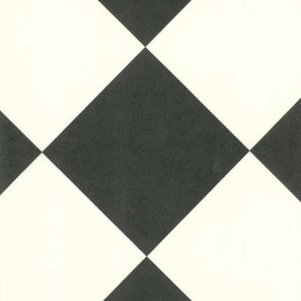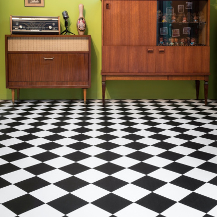 Sol lino, vinyle, PVC En rouleau Happy Days - Effet damier diagonal noir & blanc