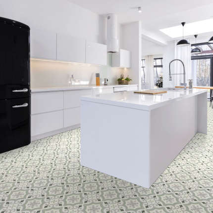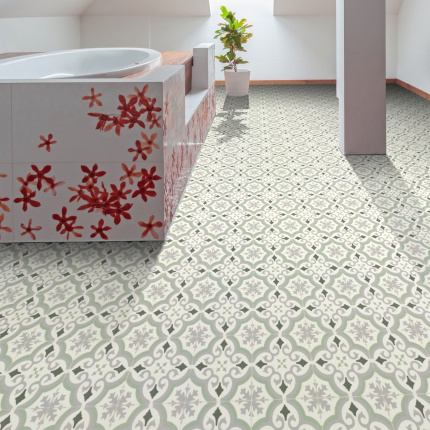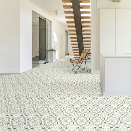 Sol Vinyle Textile économique - Effet carreaux de ciment arabesques - Vert et gris