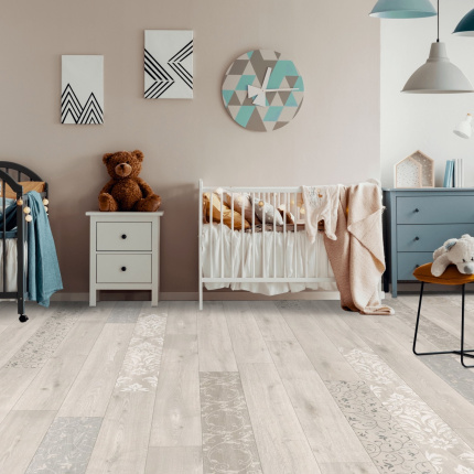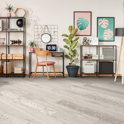 Sol Vinyle Textile - Relief 3D - Imprimé parquet clair effet pochoir volutes