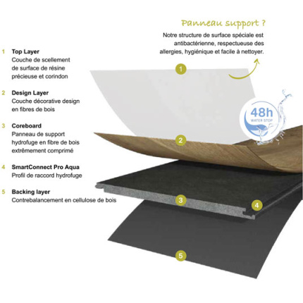 L'assemblage par Clic SmartConnect Pro Aqua permet une pose flottante facile, rapide et fiable. La forme spéciale du profil réduit au maximum la pénétration de l'eau. La technologie SEAL protège le sol jusqu'à 48 heures (en pose collée) contre les liquides restant à sa surface, minimisant le gonflement du matériau et préservant l'aspect du parquet grâce à une couche protectrice faite d'un mélange de résine précieuse et de corindon.