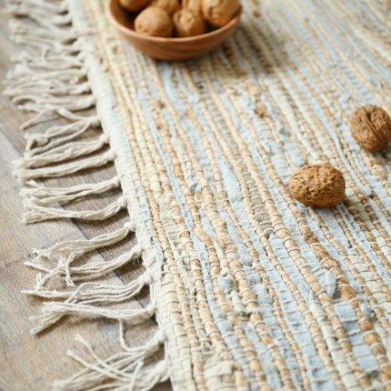 Tapis éco-design aux teintes poudrées, fabriqué à partir d'un mélange délicat de cuir recyclé, de jute et de coton, pour une déco à l'esprit Nature. Un jeu de matières et de couleurs très harmonieux. Ce tapis est une combinaison des grandes inspirations du moment : l'upcycling et le style Japandi.