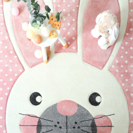 Tapis enfant fille - Lapin blanc - Rose pastel à pois