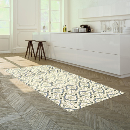 Créez votre tapis aux dimensions de votre choix. Prix indiqué au m². Tapis vinyle, imitation carreaux de ciment pour une déco tendance. Couche d'usure hautes performances contre les salissures et la poussière.