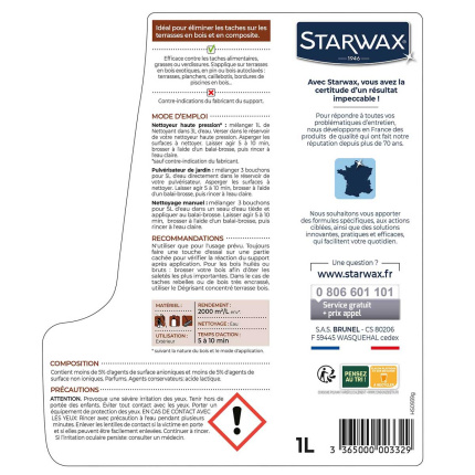 Nettoyant concentré, de la marque Starwax, pour les terrasses en bois et les terrasses en composite. Idéal pour éliminer les taches alimentaires, les taches de gras et pour retirer les verdissures sur les terrasses en bois. Il redonne au bois sa couleur d'origine.